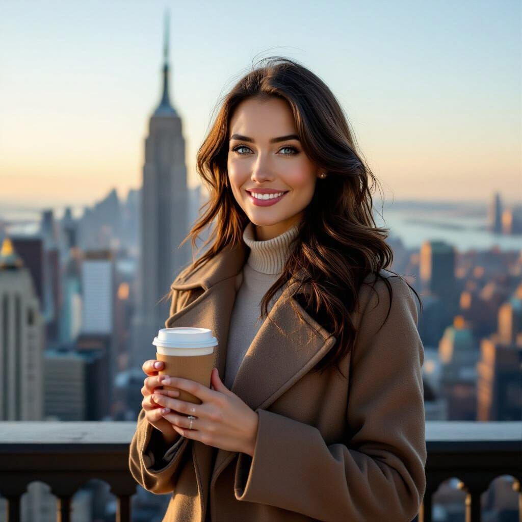 This image shows a beautiful woman walking in front of the Empire State Building on a crisp autumn morning. She is wearing an elegant coat and holding a latte, captured in an art nouveau style.
