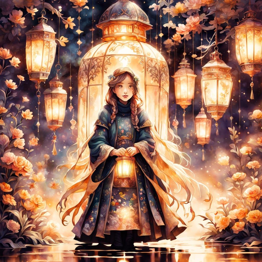 This image shows a whimsical fantasy world contained within a lantern. The dreamy watercolor style art features soft glowing light, vibrant floral patterns, and warm golden hues, creating a cozy and enchanting atmosphere.