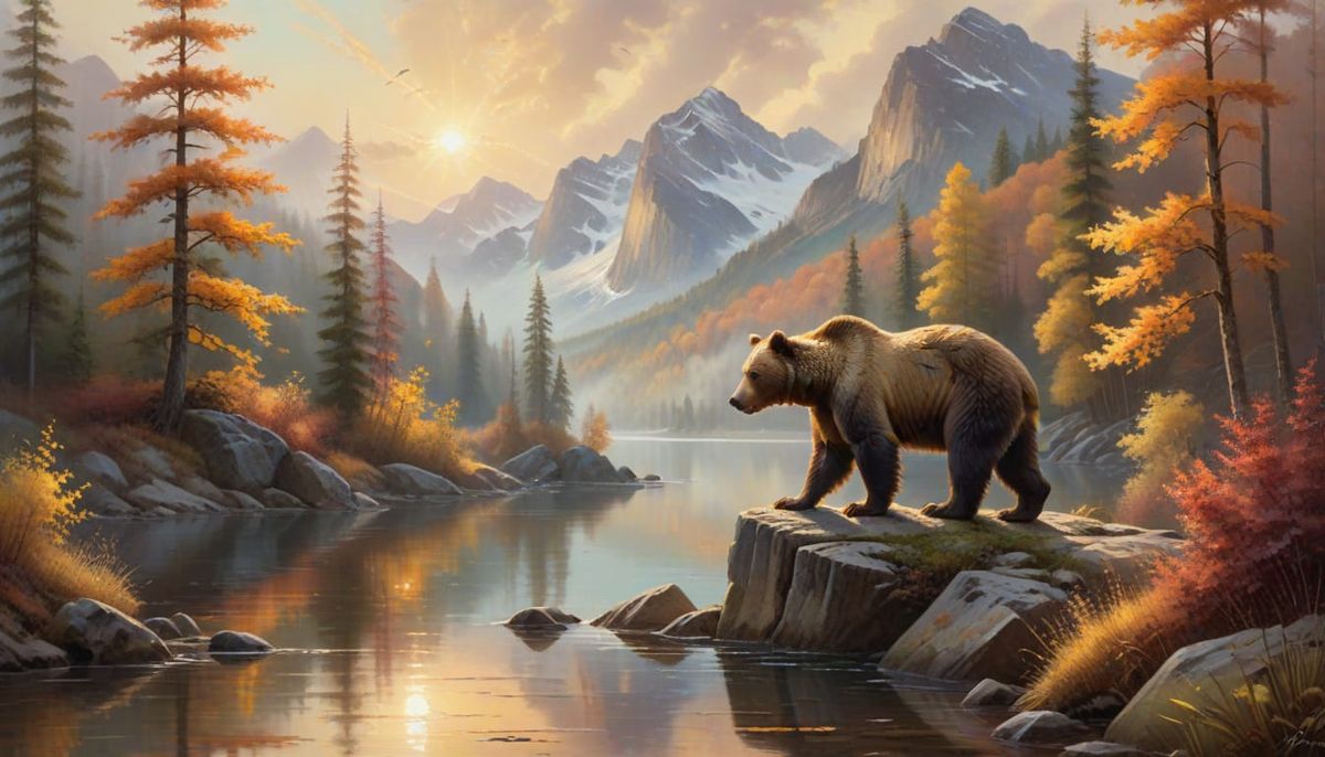 This idyllic oil painting captures a majestic brown bear standing on a cliff, overlooking a crystal clear lake surrounded by autumnal mountains. Warm, golden light and soft brushstrokes evoke a serene and peaceful atmosphere, reminiscent of Impressionist masterpieces.