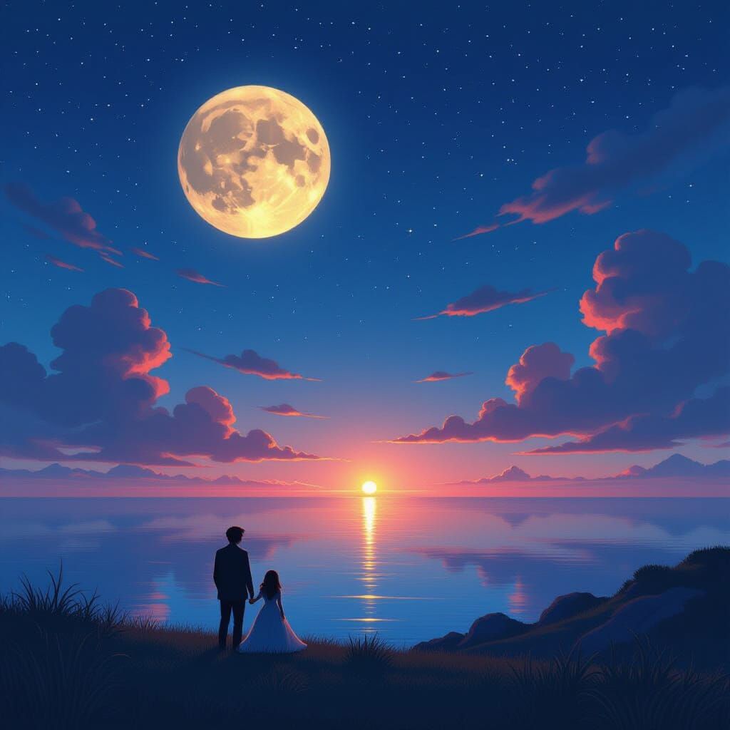 A captivating image of a starlit night with the moon illuminating the sea. Warm colors create a dreamy, magical atmosphere reminiscent of animated and digital art styles.