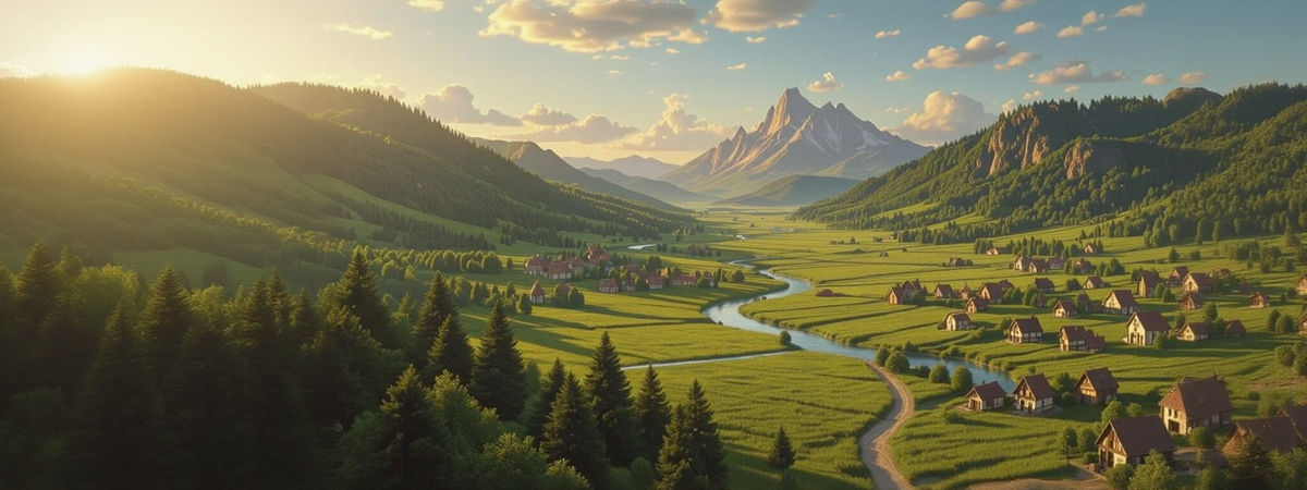 This is a detailed matte painting of a verdant medieval plain with houses, a forest, river, and mountains. It transitions from a warm sunset to a starry night sky.