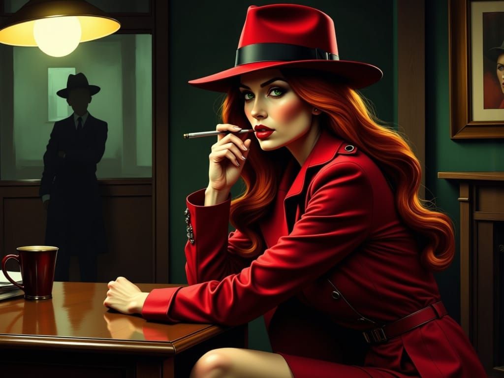 This image is a striking representation of a femme fatale, depicted in a film noir aesthetic, with a focus on dramatic lighting and muted colors. She sits with elbows on a wooden desk, smoking a cigarette, exuding mystery and sophistication.