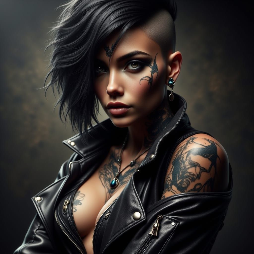 A photo-realistic image of a dark-skinned, butch woman with sharp features, wearing a leather jacket and sporting a shark-inspired tattoo, with a hint of vampiric flair.