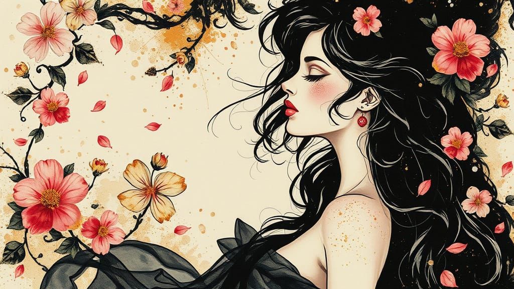 This enchanting image depicts a serene and confident nymph with delicate features, set against a dreamy backdrop of mixed media textures and golden accents, evoking an ethereal atmosphere