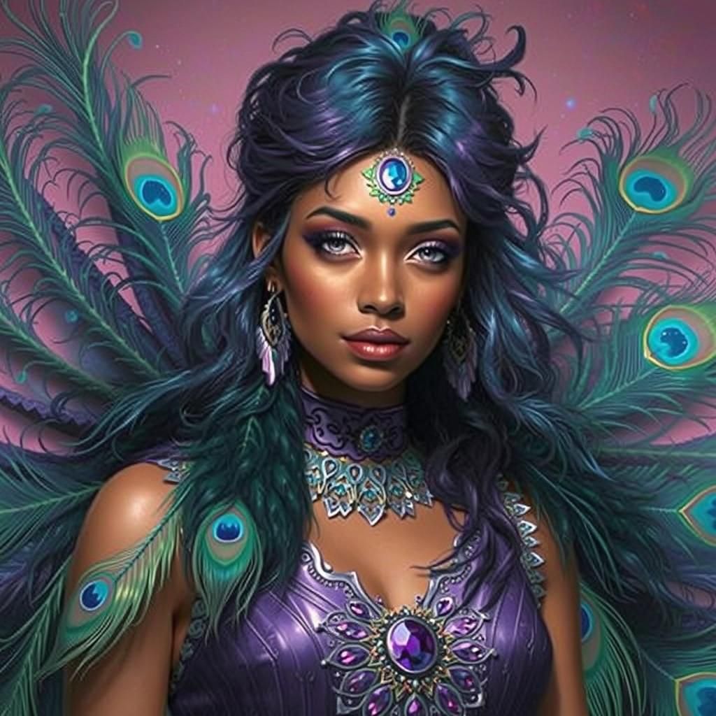 A digital painting of a beautiful woman with rose gold and dark brown skin, adorned with peacock feathers and orange flowers, set against a vibrant rainbow background. The artwork has a dreamlike quality.