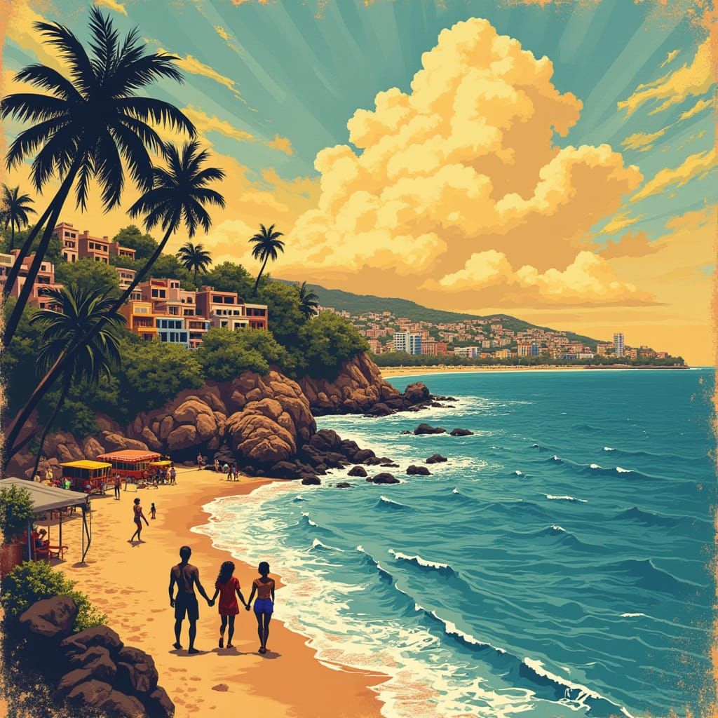 This image showcases a retro comic book style cityscape rendered in a vintage serigraphy technique, featuring vibrant colors and bold outlines.