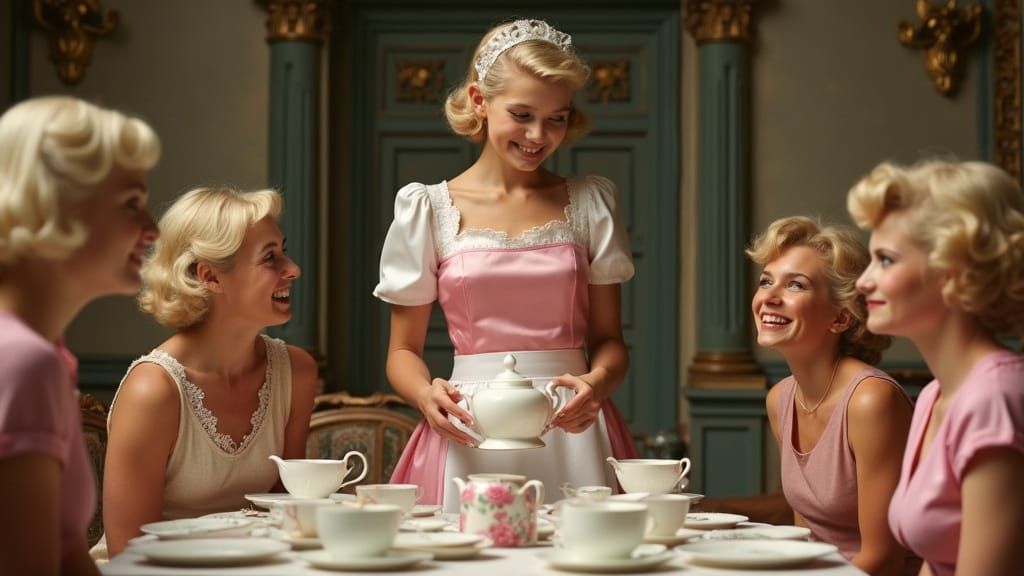 This image shows a melancholic 18-year-old at a tea party. The teenager, dressed as a French maid, stands among laughing women in an image featuring satirical elegance and vibrant colors.