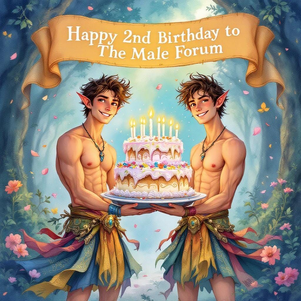 A vibrant watercolor illustration of two handsome, slender elves holding a large decorated cake with glowing candles. The background features magical light, forest motifs, and floating flower petals.