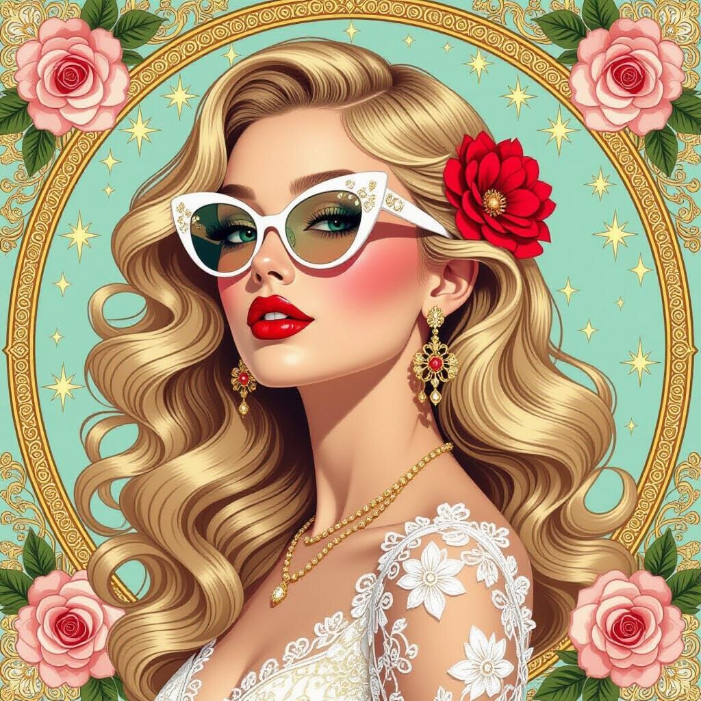This image shows a beautiful blonde woman with red lips in an intricate dotwork style. The surreal, Art Nouveau portrait features roses, jewelry, and cat eye sunglasses.