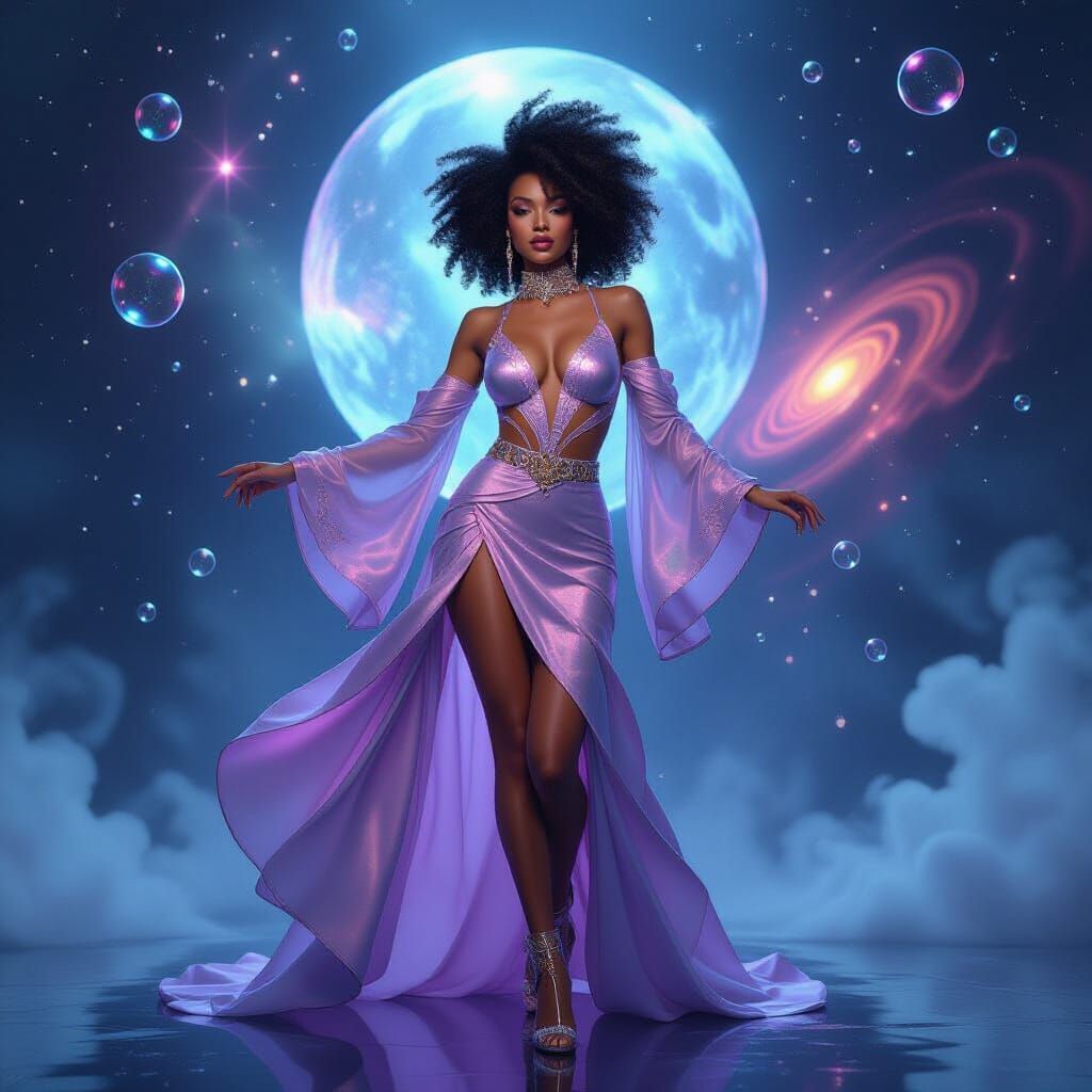 This image shows a futuristic diva with iridescent skin dancing in a smoky cosmos. This artwork blends dramatic lighting with art nouveau elegance and afrofuturistic elements, reminiscent of 90's acid jazz album covers.