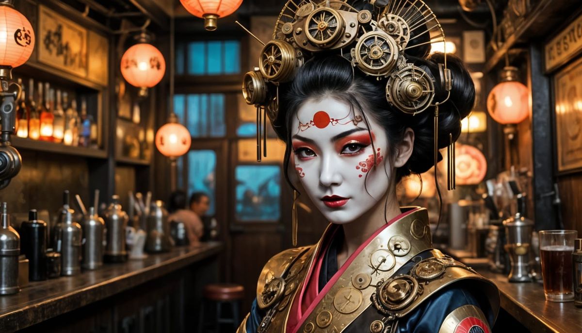 This image depicts a steam punk geisha surrounded by the industrial atmosphere of a themed bar, with a neon sign reading 'Oasis' in the background, blending traditional and futuristic elements in a vibrant setting.