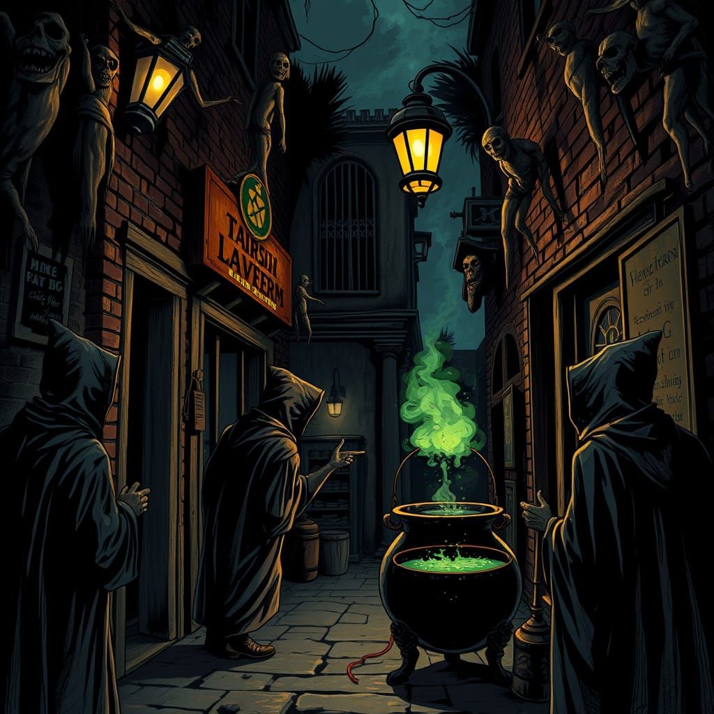 This image depicts a sinister voodoo ritual in a dark, narrow alleyway. Hooded figures perform the ceremony under a gas lamp, with strange effigies and a glowing cauldron, in a macabre, unsettling style.