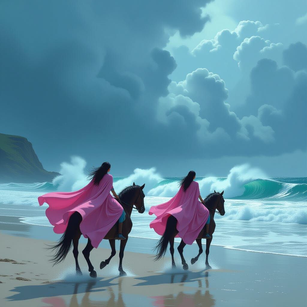 This image shows two women with black hair riding horses on a beach during a storm. The scene features massive dark green waves and dramatic lighting, with a digital art aesthetic.