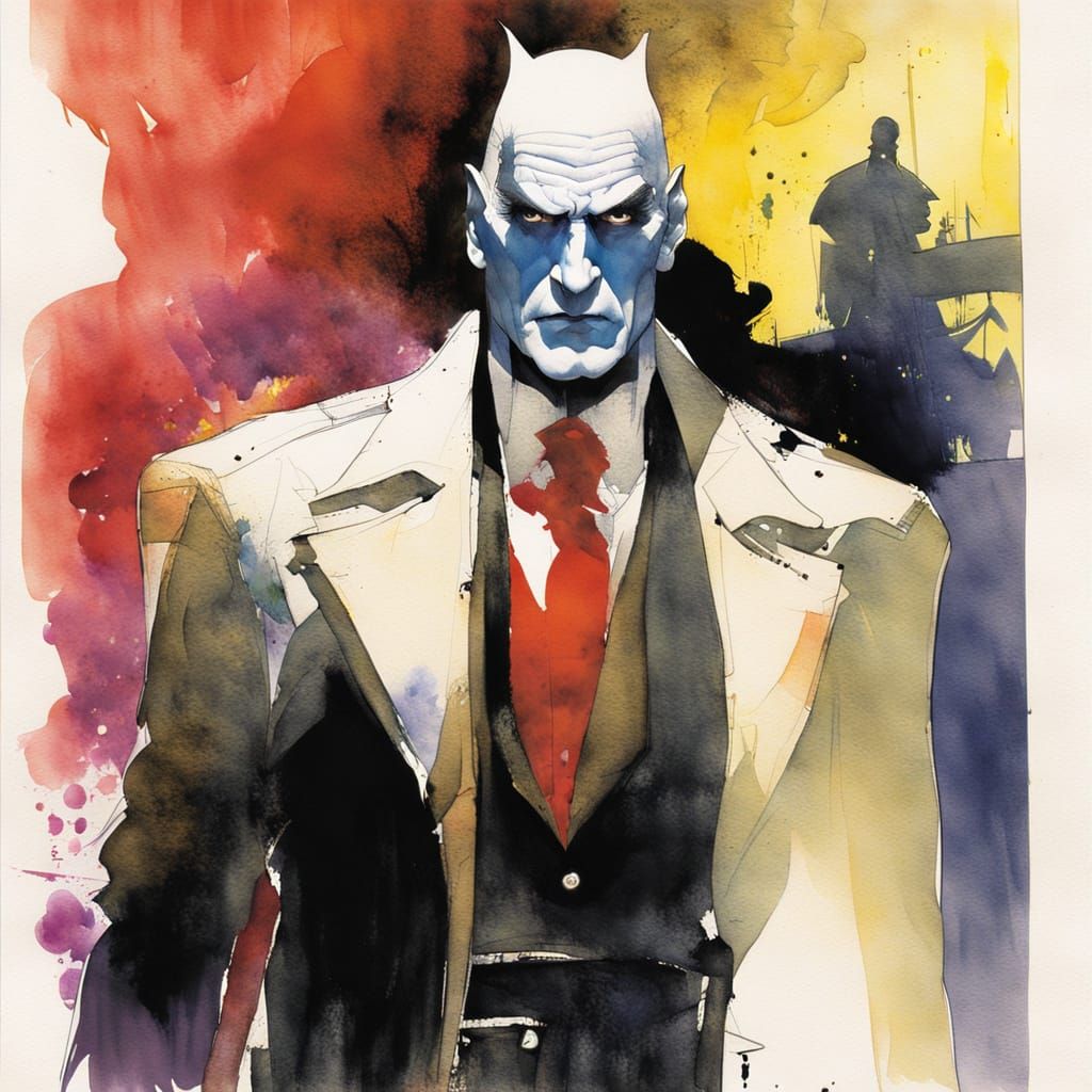 This image shows a villain rendered in a messy watercolor style. The artwork evokes a comic book aesthetic, reminiscent of expressive graphic novel art.