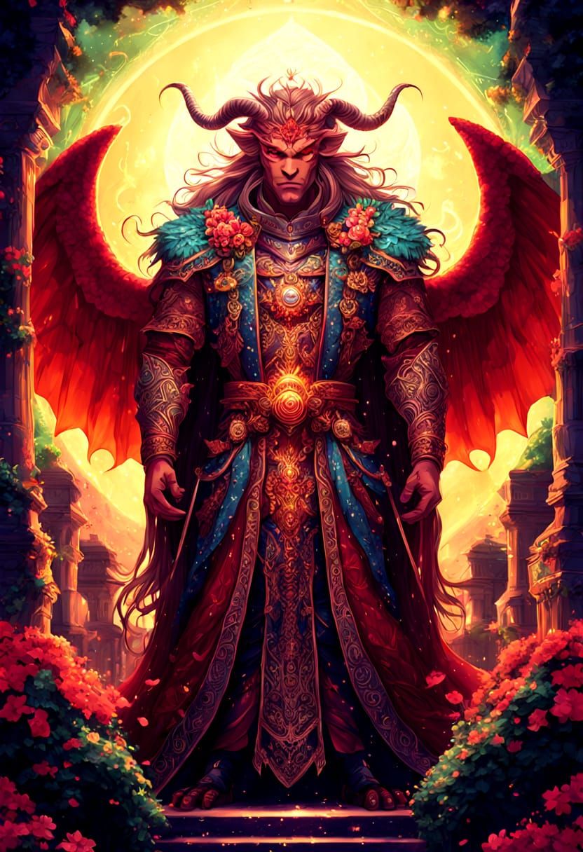 A striking picture of a handsome demon with long, floating hair being chosen by the gods at a sacred temple. The image is rendered with vibrant colors, dramatic lighting, and sparkling particles in a fairycore aesthetic.