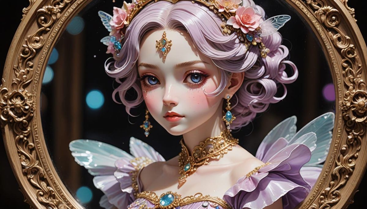 This image shows a slender fairy figurine in a ballet pose standing on a music box in baroque anime art. The fairy is bejeweled, with light reflections and soft shadows.