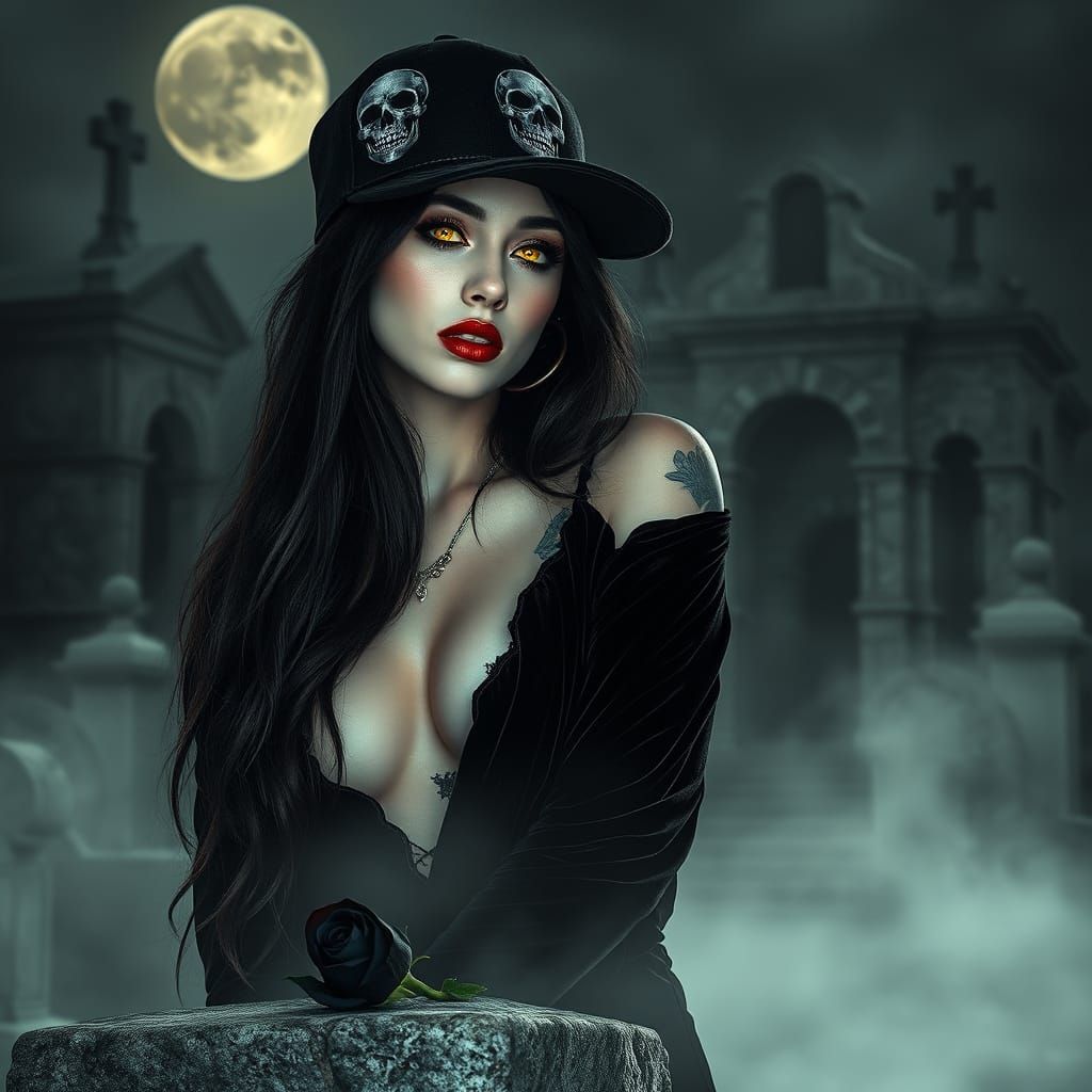 A seductive, breathtakingly beautiful gothic woman stands alone before a crumbling, moonlit mausoleum, her lithe figure draped in tattered black velvet that clings to her perfect curves. Her pale skin glows ethereally in the moonlight, long raven hair cascading wildly from her hip-hop cap that has skull ...