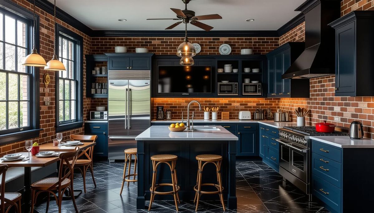 This image shows a richly detailed Victorian kitchen in deep blue and brick tones. It features antique furniture, modern appliances, and ambient lighting, rendered with the atmospheric depth of romantic realism.