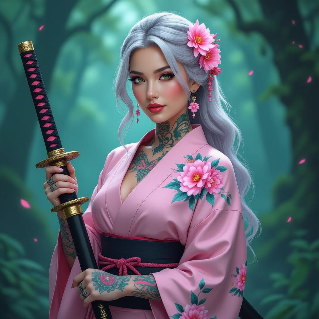 A striking picture of a woman with grey and pink hair, floral tattoos, and a pink kimono, holding a katana. She stands in a dark forest with sparkling lights, rendered as photorealistic digital art.