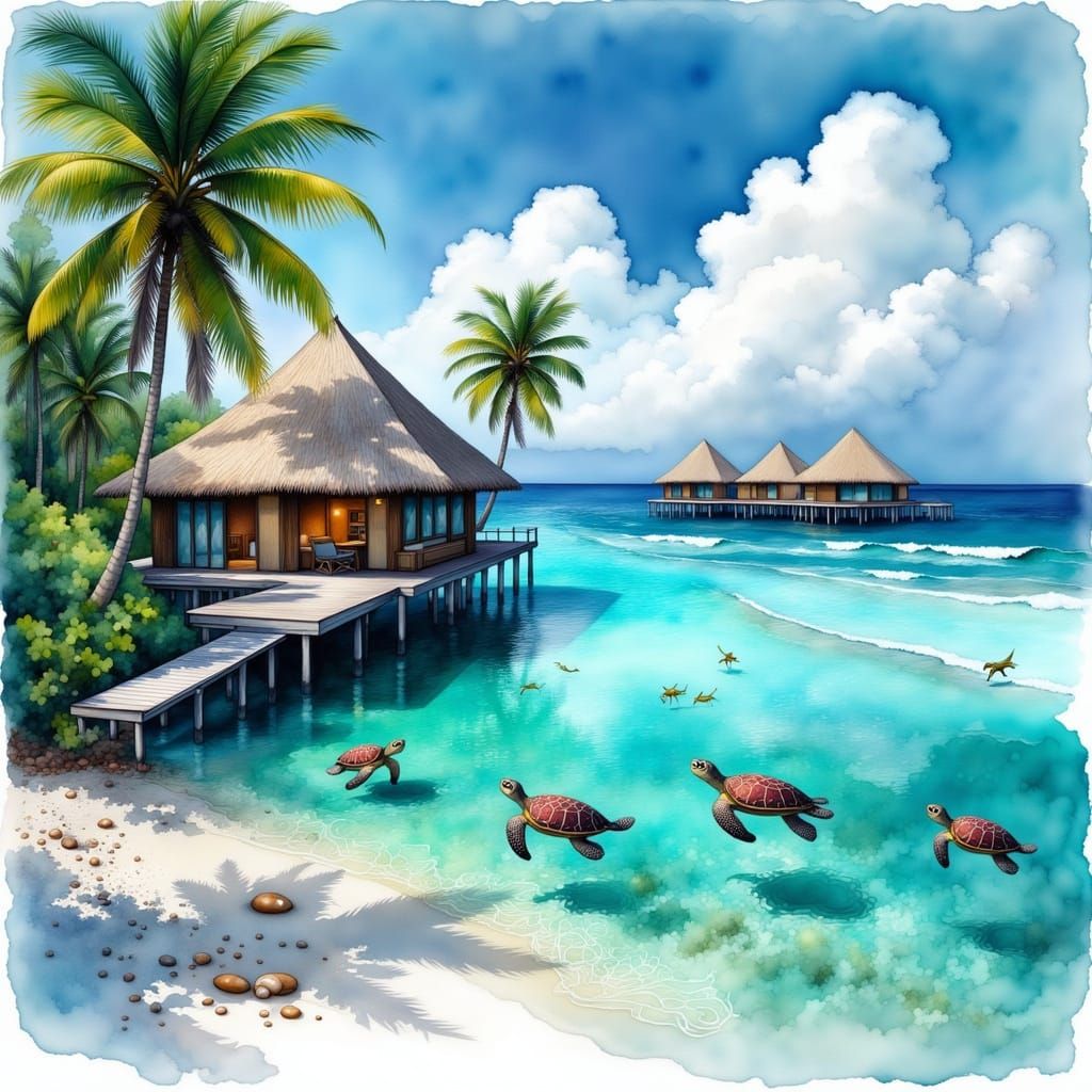 This image showcases a serene, watercolour-inspired scene of The Maldives, featuring luxury villas, turtles, and a vibrant coral reef, all blended in a soothing liquid ink aesthetic