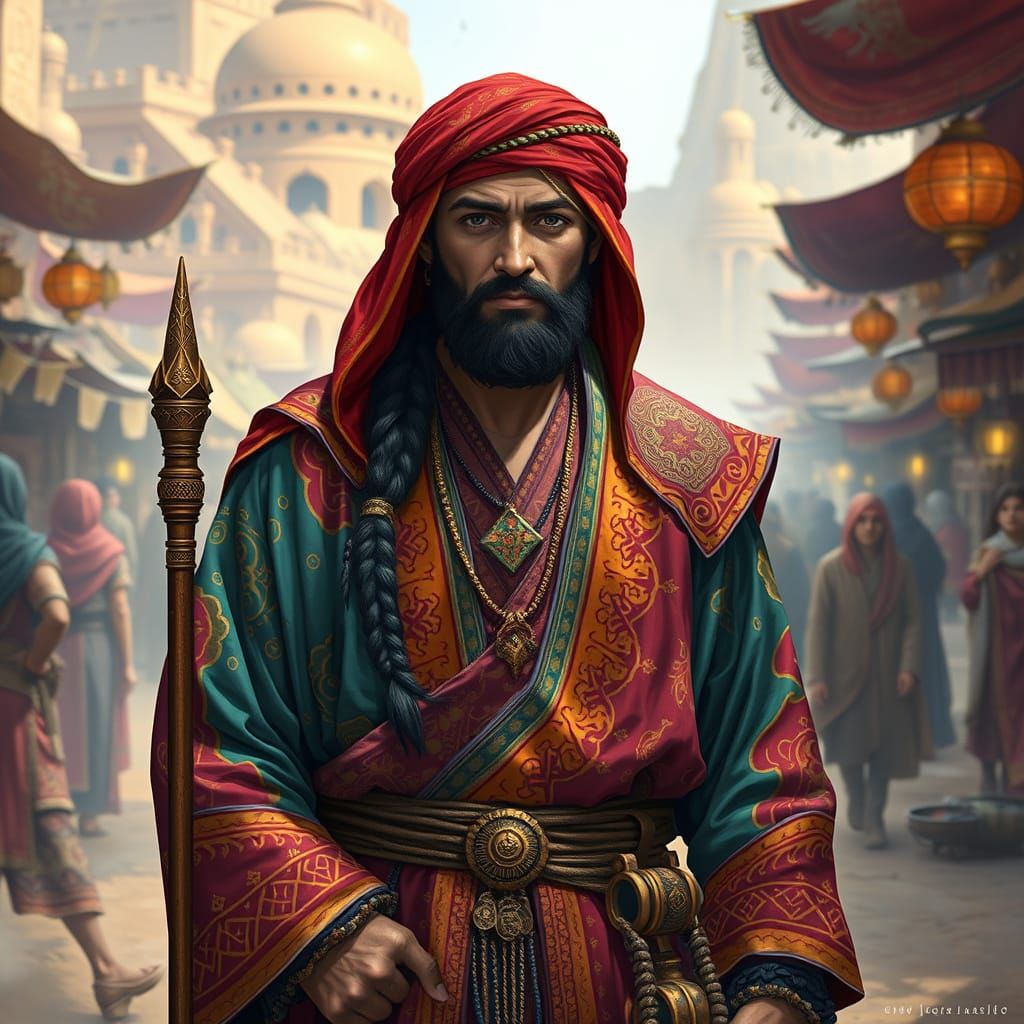 This image depicts a medieval fantasy merchant dressed in ornate, Arabic-inspired robes, standing in a bustling desert market surrounded by mystical energies and distant caravans, blending traditional merchant style with mysticism in a unique, stylized fantasy world.