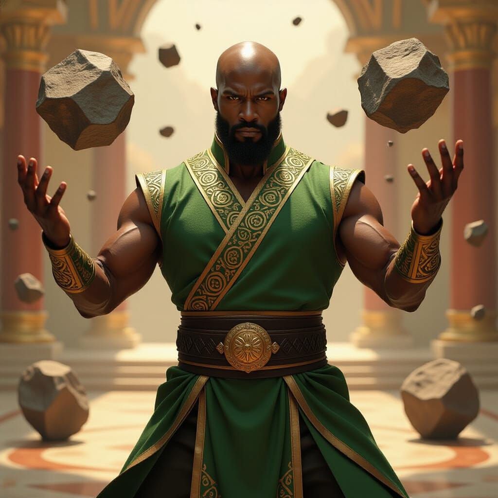 A striking image of a powerful, realistic-looking older Black man earthbending in a grand palace. The cinematic style features dynamic lighting and earthy colors, emphasizing raw power and regal presence.