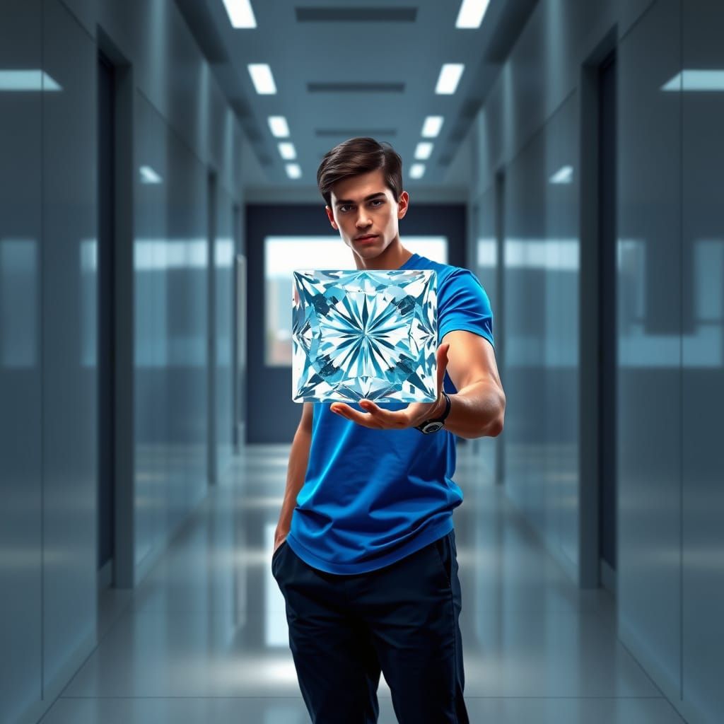A young man stands in a sleek, modern space, holding a gleaming square diamond block that shines with mesmerizing facets, evoking a sense of industrial futurism and sci-fi wonder