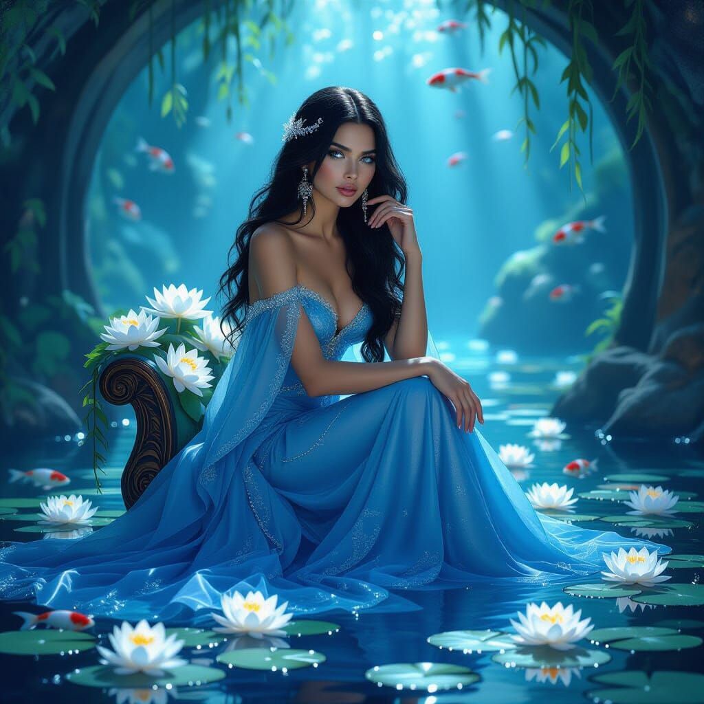 This image shows a beautiful woman with flowing black hair and blue eyes seated on a throne of water lilies in a grotto. The scene is reminiscent of Pre-Raphaelite paintings, with soft lighting and a romantic, ethereal atmosphere.