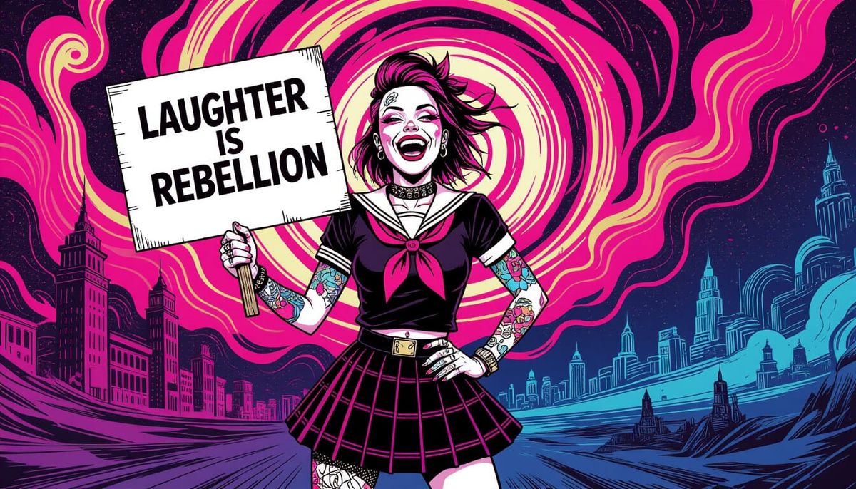 This image shows a young punk woman with colorful tattoos laughing while holding a sign. The image blends art deco elements with dystopian and futuristic aesthetics. It has a gloomy yet dreamlike atmosphere.