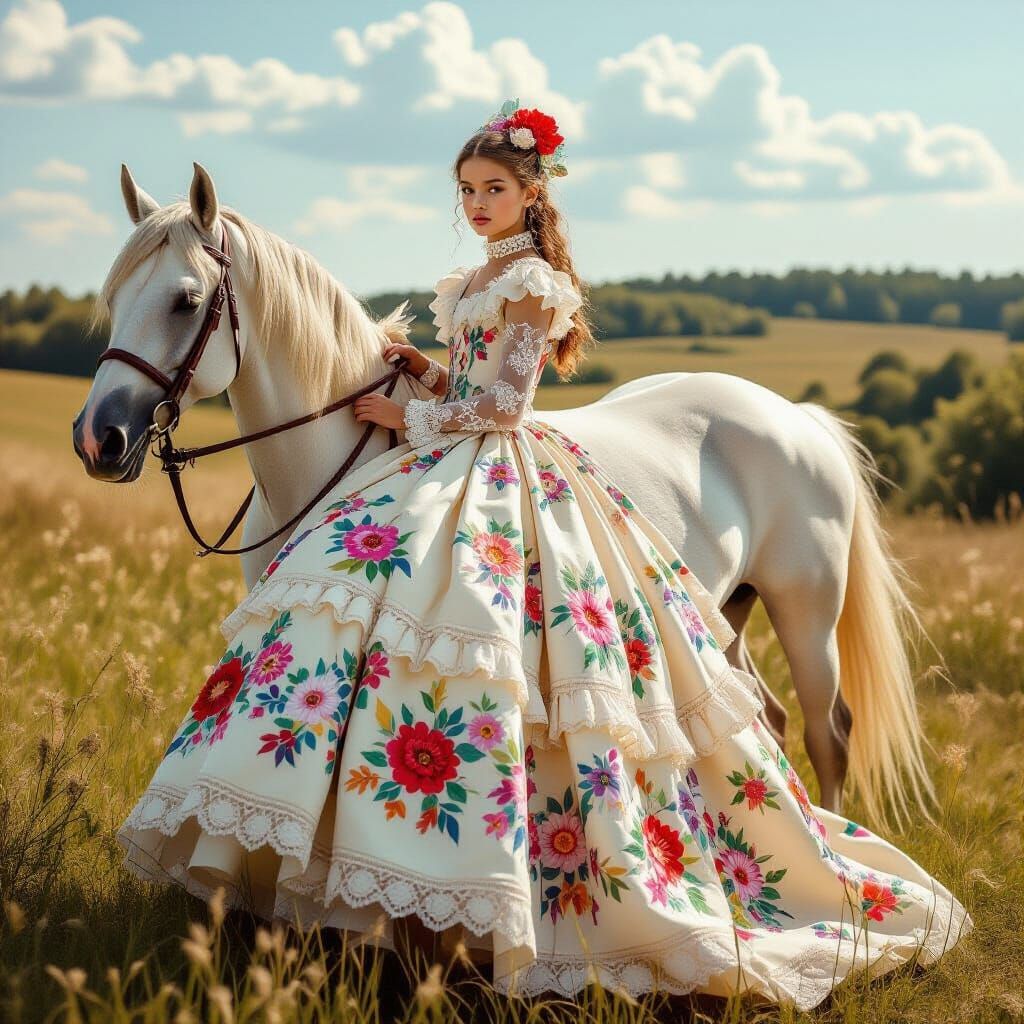 A striking picture of a girl in an antique dress riding a horse in the French countryside. The image blends vintage elegance with vibrant colors and expressive brushstrokes.