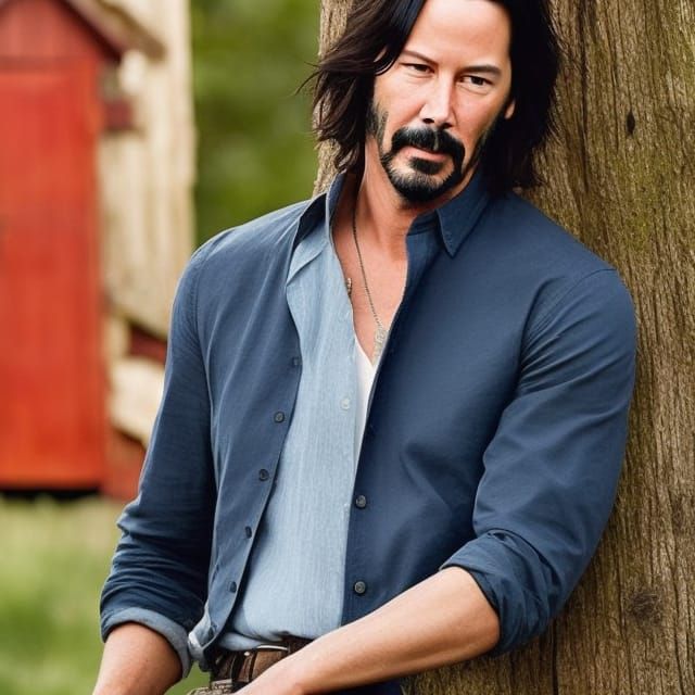 This image shows Keanu Reeves as a disheveled farmhand with an unbuttoned shirt outside a barn. The image is reminiscent of a trashy romance novel cover with vibrant colors.