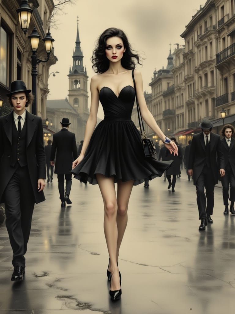 This image shows a 1950s-style pin-up woman with bold makeup and attire, standing confidently on a busy city street, captured in a moody, surreal style.