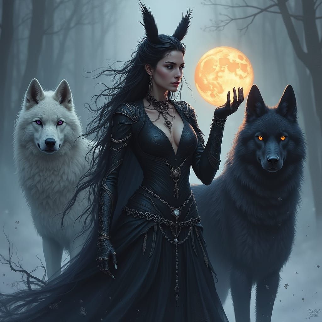 This image depicts a powerful female Viking warrior and a sinister electric-witch, accompanied by two wolves, one holding the sun and the other the moon. In a style reminiscent of Greg Rutkowski.