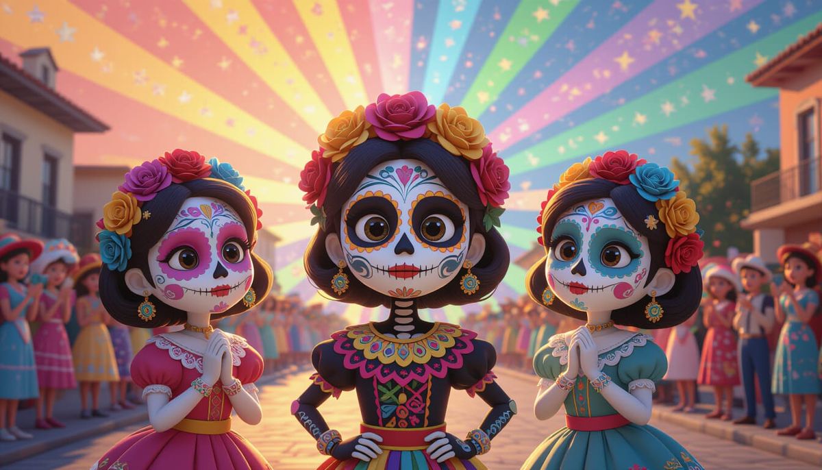 This image showcases girls painted as sugar skulls in a lively Dia de los Muertos parade. Rendered in a 3D cartoon style with cinematic lighting and rich textures.
