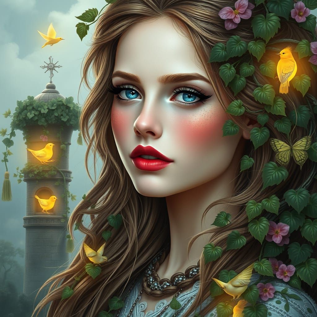 A stylish image of a bohemian girl with rosy cheeks, bold berry lips, and sky-blue makeup. Her hair twists into ivy-covered towers as glowing birds perch in the vines, illuminating her ethereal expression.