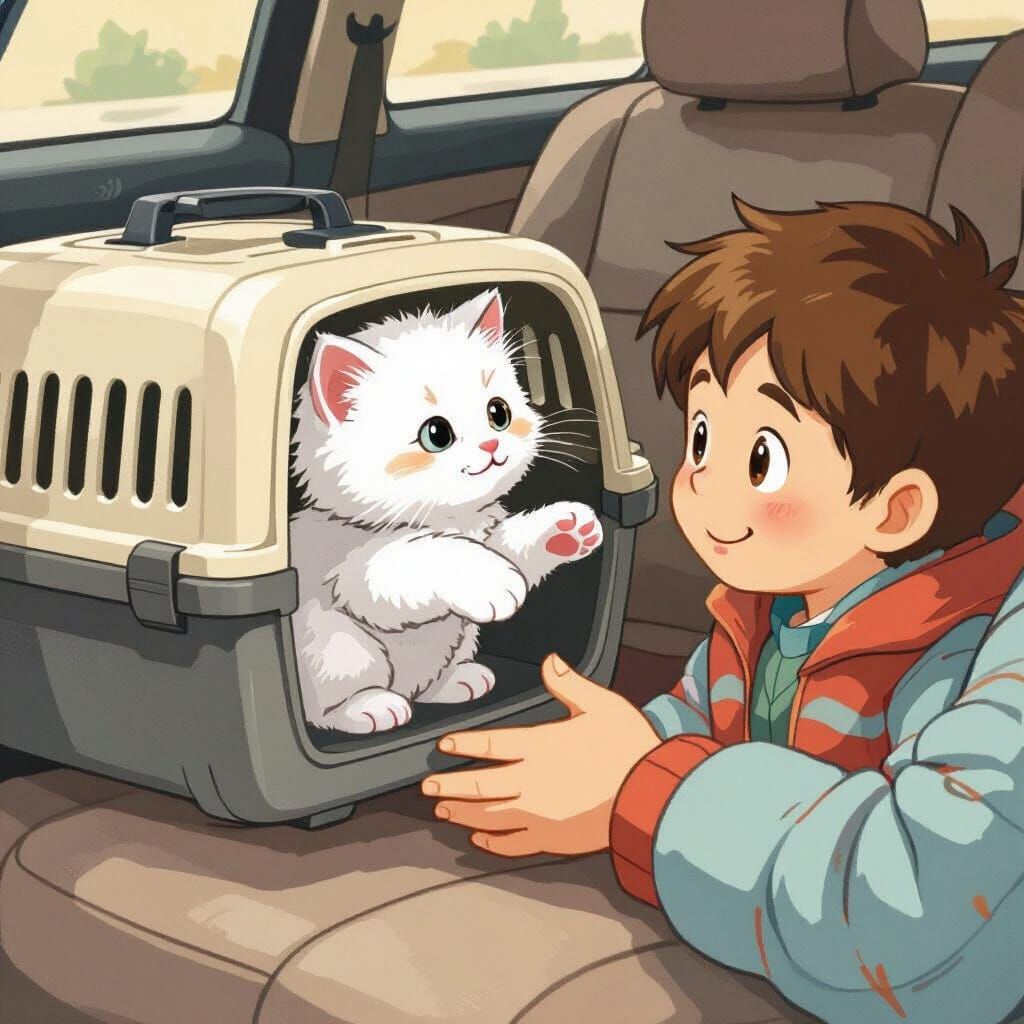 This image shows a fluffy white kitten in a carrier, reaching its paw towards a boy's hand. The scene is rendered with whimsical details and playful geometric patterns.