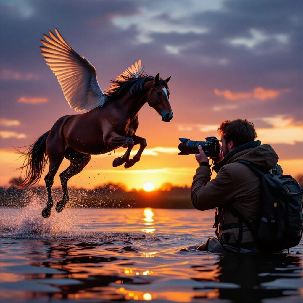 This image shows a wildlife photographer capturing a magical moment of a flying horse over water at sunset. Hyperrealistic concept art with dramatic lighting and vibrant colors.