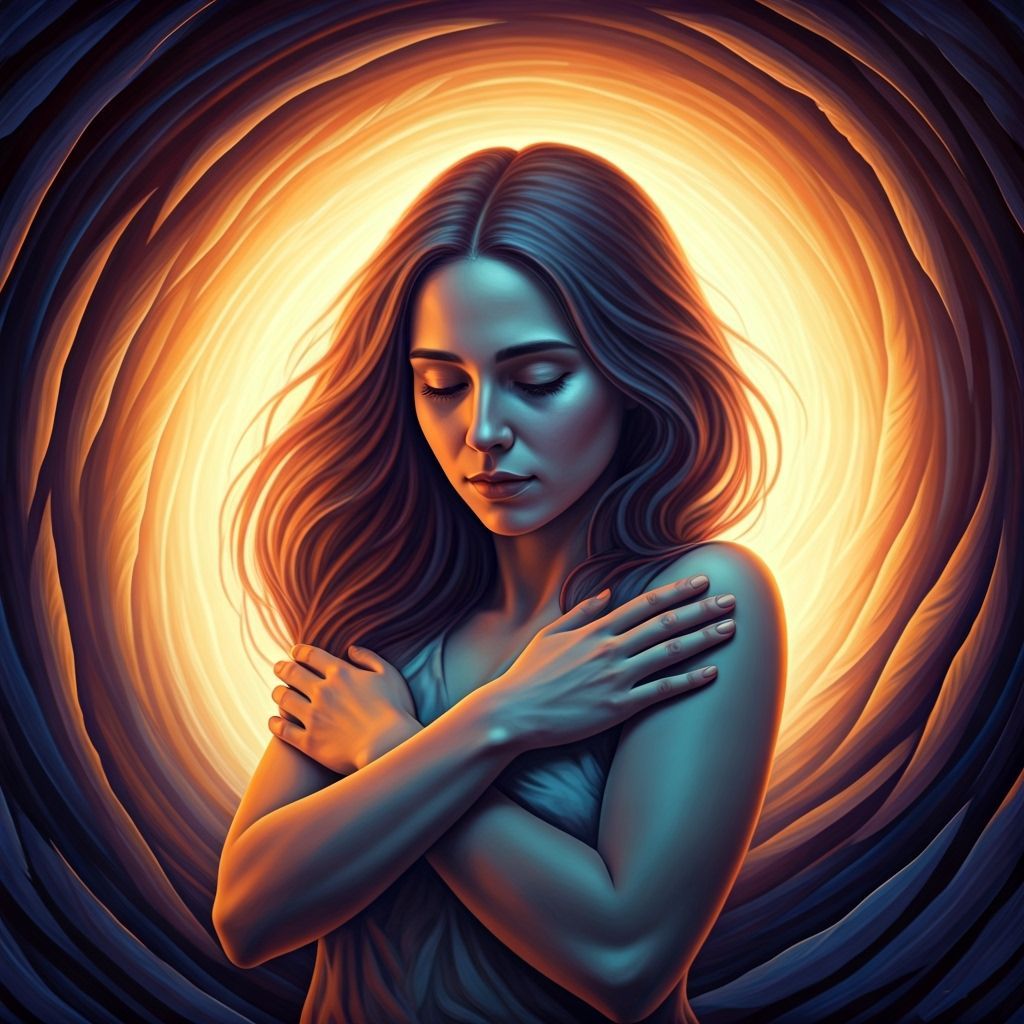 A captivating image shows a woman amidst a radiant aura, embodying love and fear. The dreamy composition features vibrant, swirling colors and soft textures in an ethereal style.