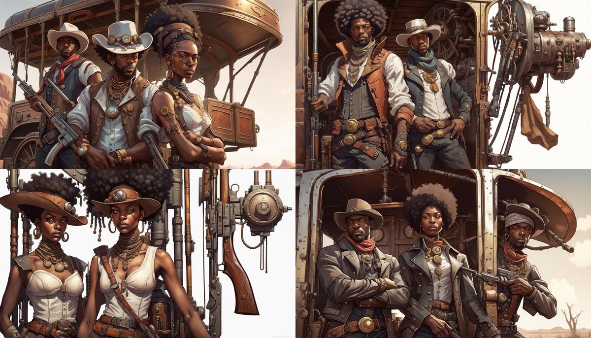 This image shows a group of Black cowboys and cowgirls in a science fiction western setting. The characters wear a mix of western attire and African jewelry. Digital art with dynamic lighting and triadic colors.
