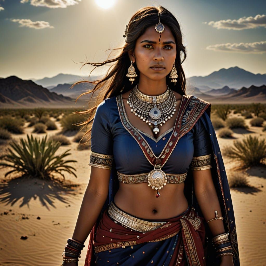 This image is a hyperrealistic portrait of a stunning woman from a nomadic Indian tribe, showcasing her vibrant traditional attire and captivating gaze as she stands amidst a desert landscape.