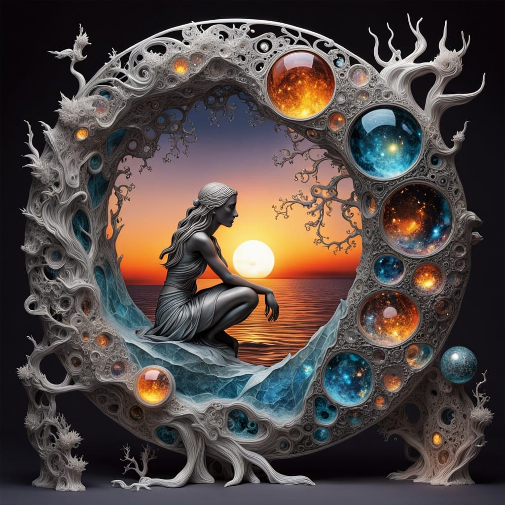 This image features a surreal collage of bio art, depicting a woman seated within an intricate, glowing spiral sculpture made of silver filigree.