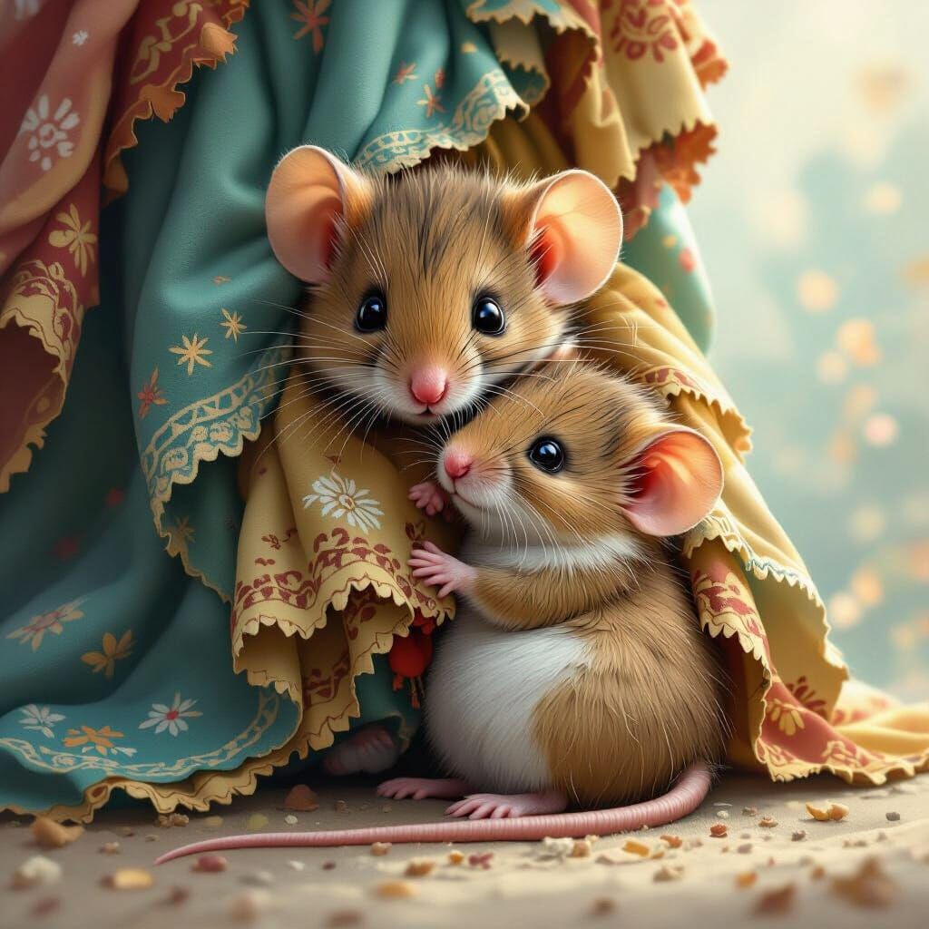 This image features an adorable baby mouse hiding behind its mother's detailed skirts. The scene is set against a whimsical background, rendered in a matte painting style with rich, deep colors and intricate textures, evoking wonder and magic.