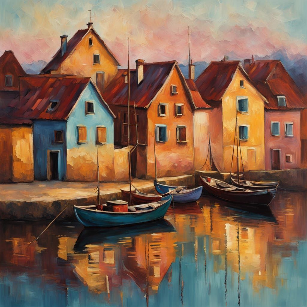 This image depicts a quaint fishing village at sunset, featuring charming houses and boats. It's rendered with impressionistic brushstrokes and vibrant gouache colors, creating a textured, dreamlike atmosphere.