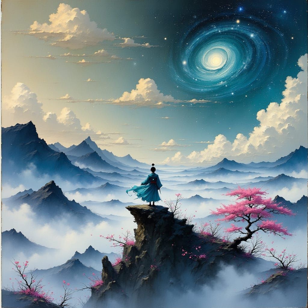 A lone samurai stands on a mist-covered mountain, observing a distant galaxy. Cherry blossoms float in the wind, presented in a Ukiyo-e style with cinematic lighting.