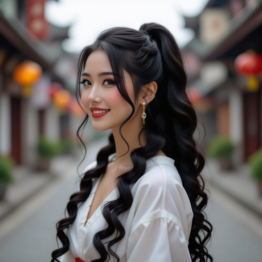 A full body shot of an amused Asian woman with long, elaborate black ringlets styled in a ponytail. The image is hyperrealistic with sharp focus and high contrast, creating a cinematic atmosphere.