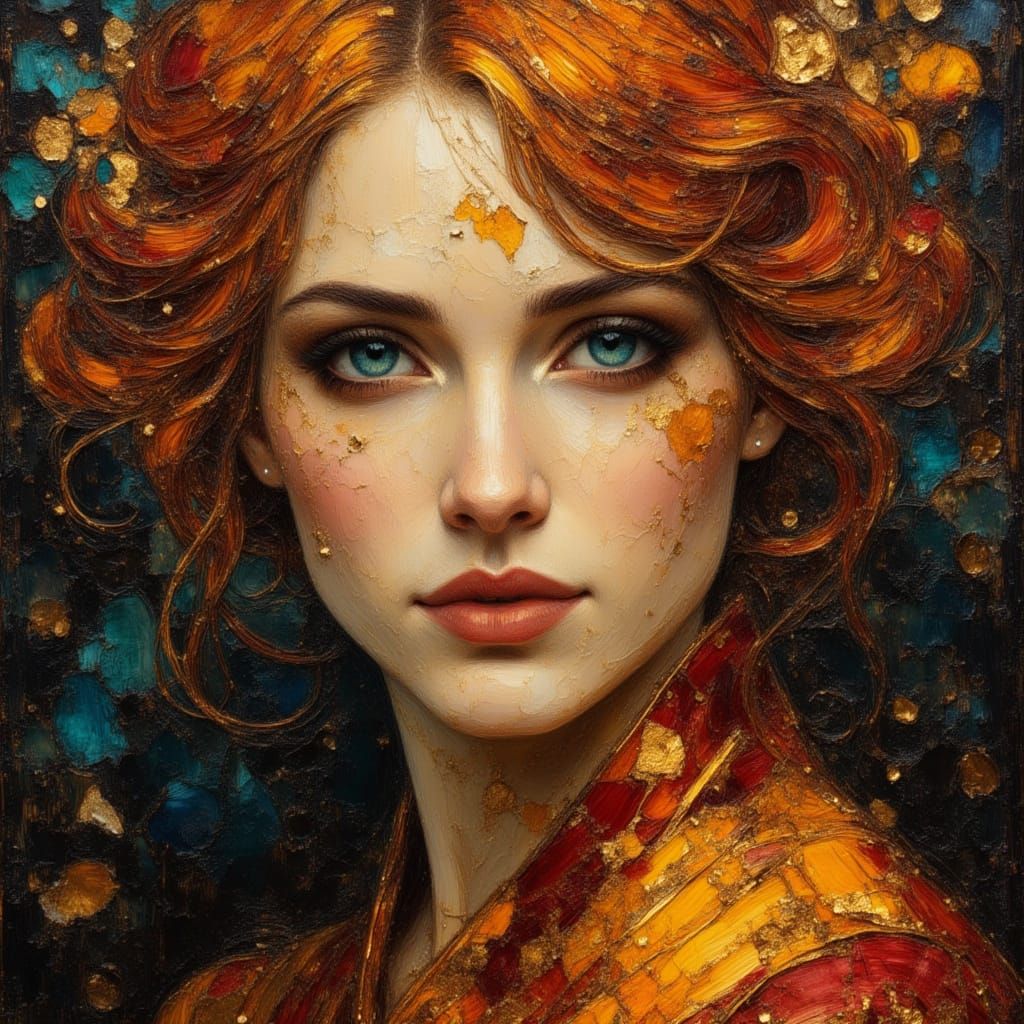 This image shows a nature goddess in vibrant orange, burgundy, gold, and teal tones. The artwork evokes the dramatic lighting and rich colors of baroque painting.