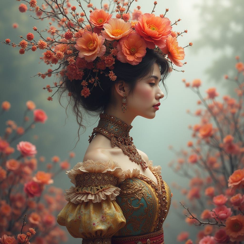 A hyperrealistic portrait of a woman in colorful Victorian clothing. The image features extravagant flowers, rich colors, and intricate textures, creating a fantastical and detailed composition.