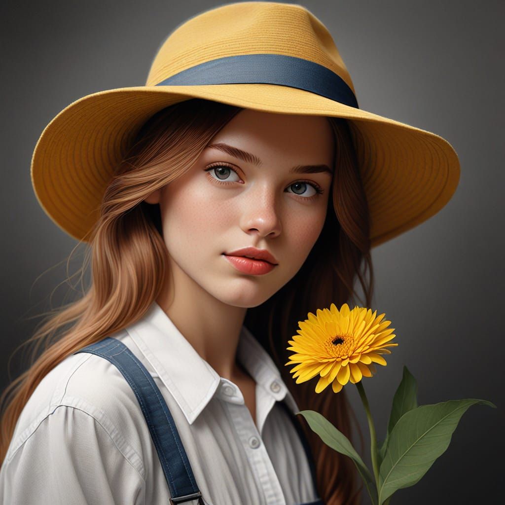 This image shows a detailed pencil sketch of a woman holding a yellow flower. The portrait uses high contrast and intricate details to capture the subject in grayscale.