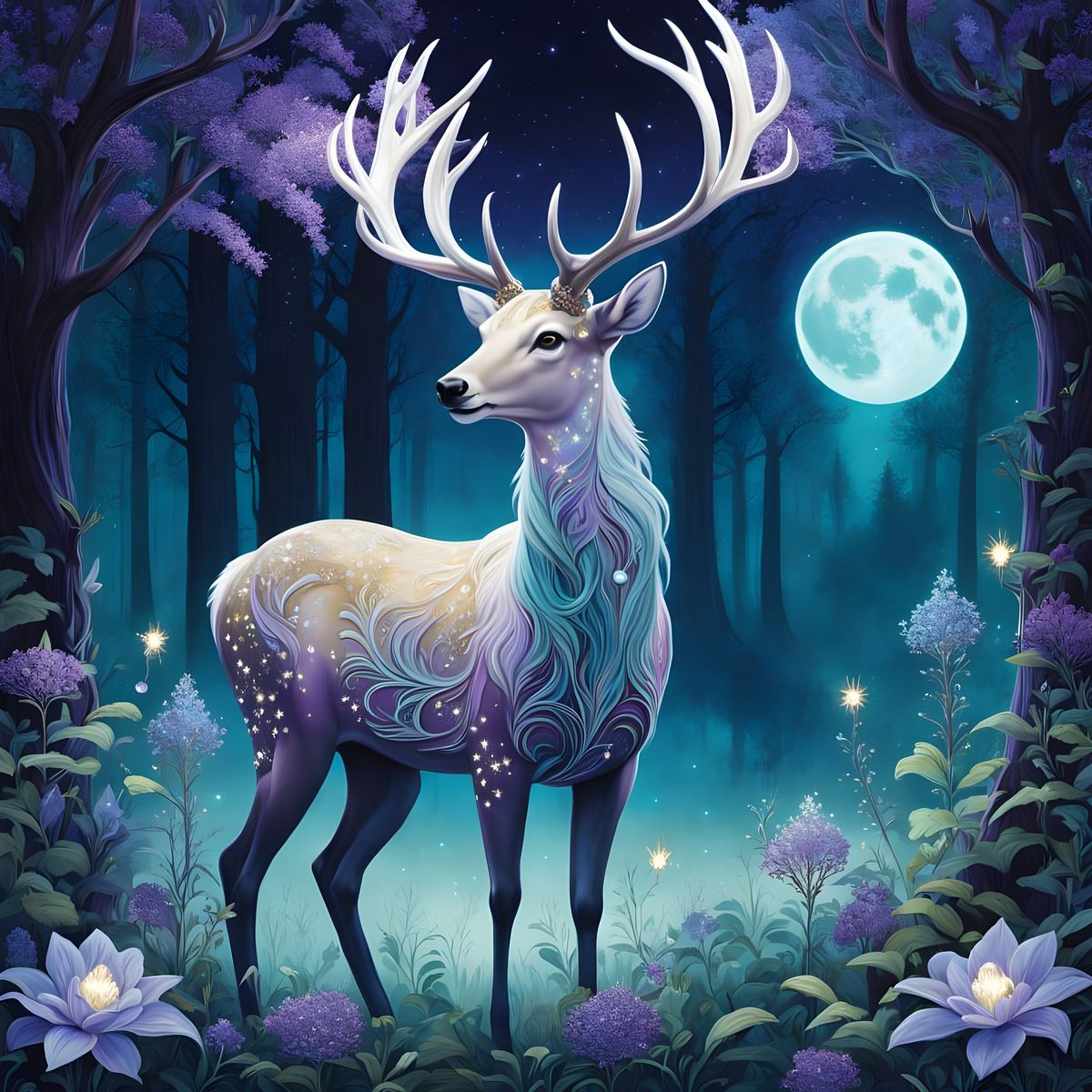 A striking picture of a stardust deer in a moonlit forest glade. The deer's antlers are decorated with glowing crystals in an ethereal fantasy style with bioluminescent flora.