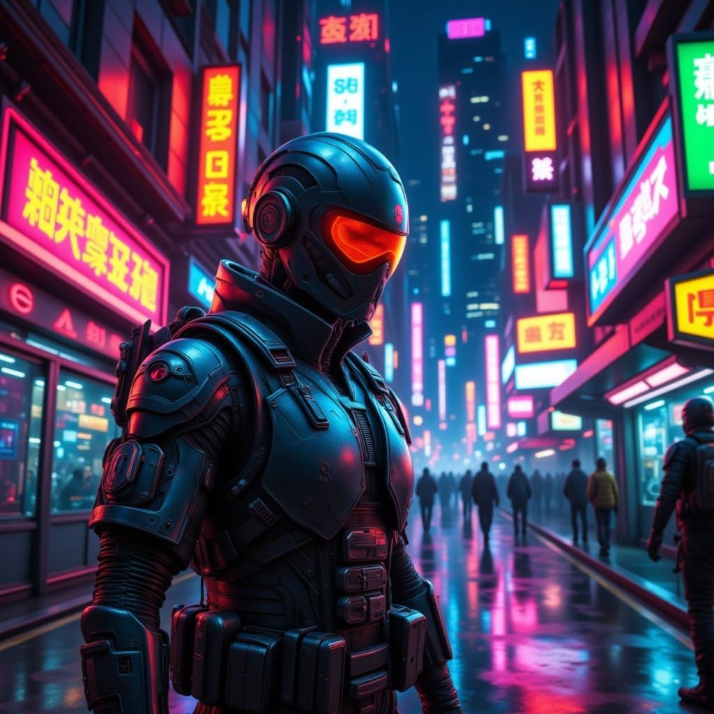 A striking image of a futuristic soldier in cyberpunk attire, illuminated by vibrant neon signs beneath city streets. This artwork captures a dark, technological aesthetic.